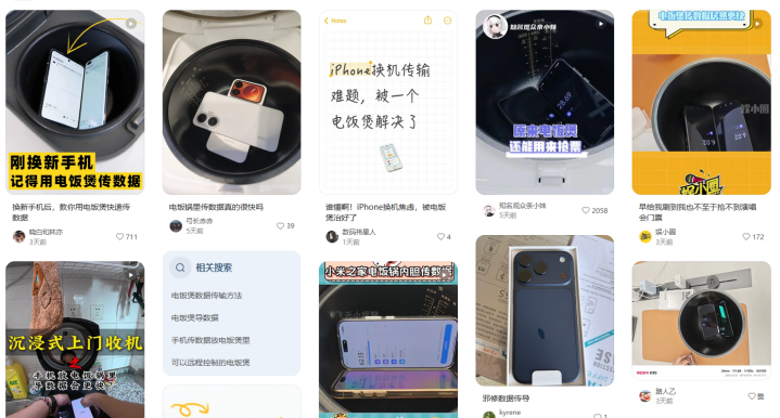 于是,有不少网友在社媒上分享了一个看起来有些莫名其妙的“偏方”:把新旧手机同时放进电饭煲的内胆里,传数据会更快。这一说法让不少网友“大跌眼镜”,尽管有不少人表示怀疑,但也有人经过“实测”后表示“确实有效”。